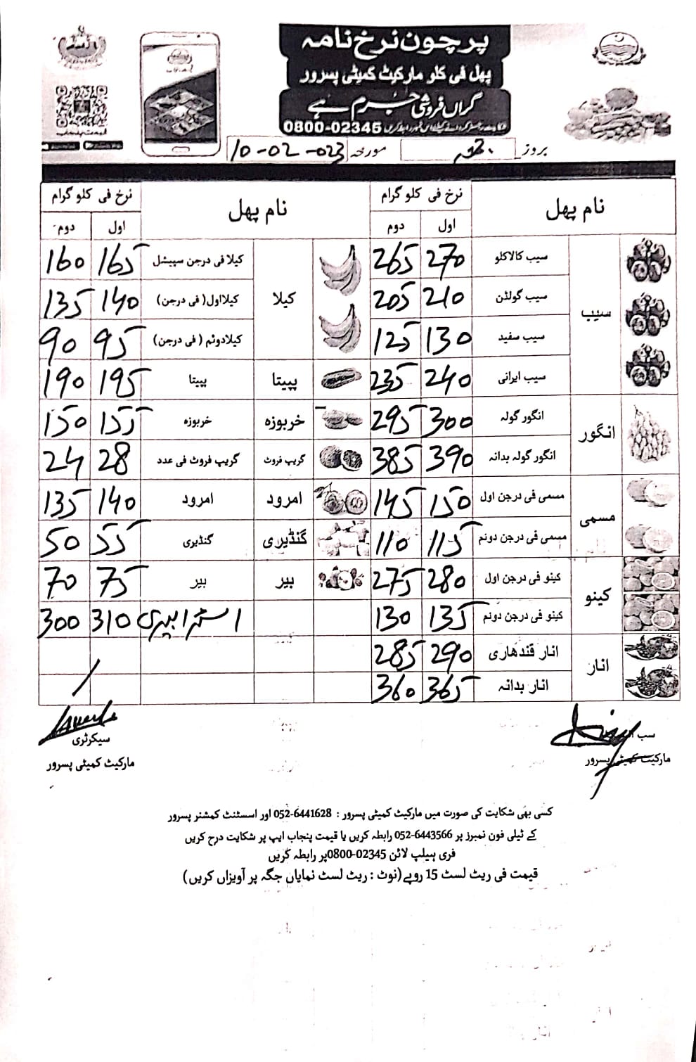 Homeریٹ لسٹ ریٹ لسٹ مورخہ 10 فروری 2023 گوشت پھل سبزیاں پسرور سیالکوٹ ڈسکہ سمبڑیال نارووال گوجرانوالہ byChandi Kalaswala -February 10, 2023 0
